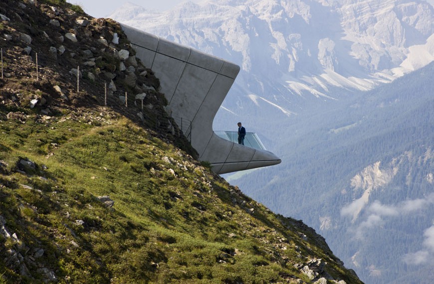 Each of the six museum offers educational content on the mountains, the ways of their creation, attractions, history, important people ... The visual identity of the sixth of the museum is the famous climber decided to leave the famous Zahi Hadid, and she was in his distinctive style, literally dug into the rock. Building into a complex array of fluid composition and interconnected volumes as if they were carved into the mountain and follow its form. Three volumes visually separated "out" from the rock, and at their ends are large glazed areas and creates the impression as if they are floating.