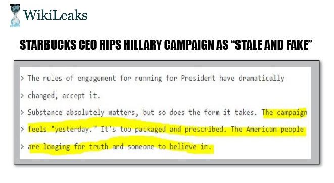 - WIKILEAKS RELEASE : Starbucks CEO SHREDS Clinton Campaign as “STALE AND FAKE”