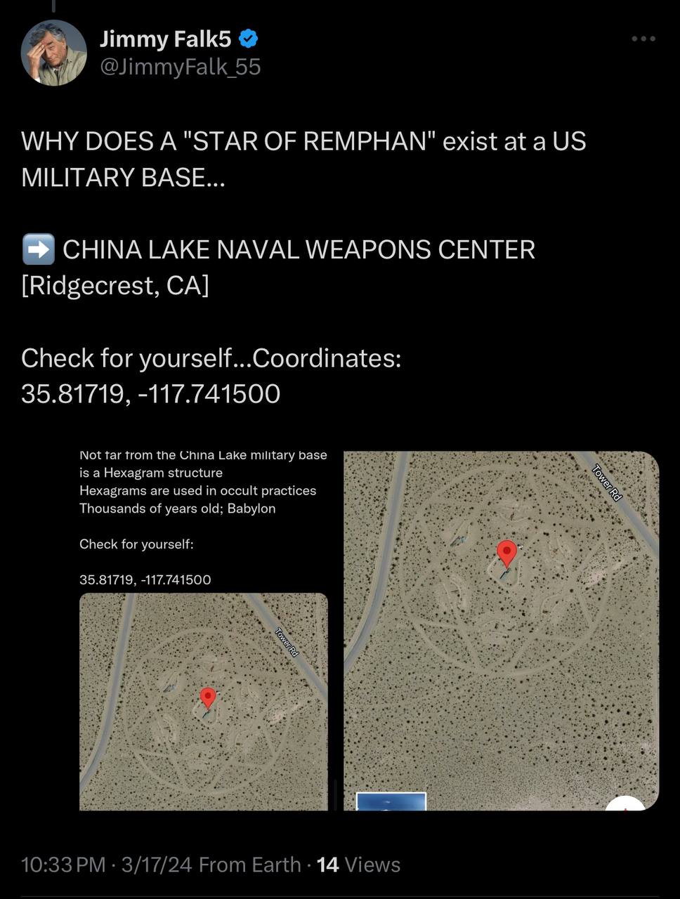 WHY is THIS "STAR OF REMPHAN" located at CHINA LAKE MILITARY BASE? (the DUMB they "earthquaked" for KID RESCUE) Posted By: jensingr