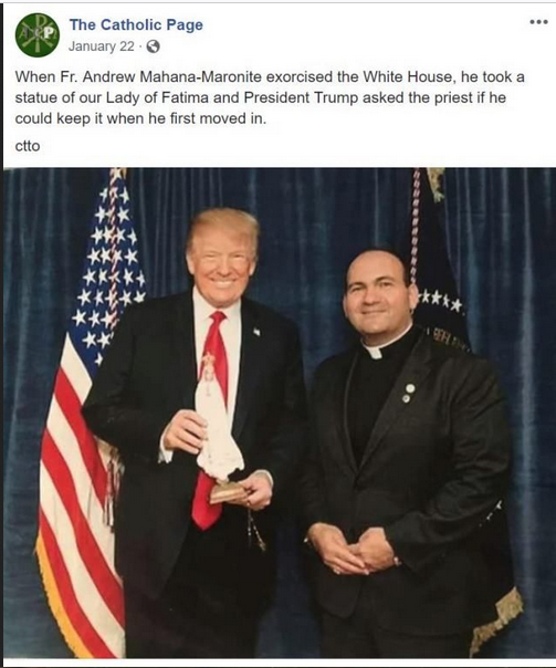 The Statue of St. Michael matched perfectly with the Statue of Our Lady of Fatima previously given to him by Fr. Andrew Mahana- Maronite who EXORCISED the WHITE HOUSE after the Satanists moved out.