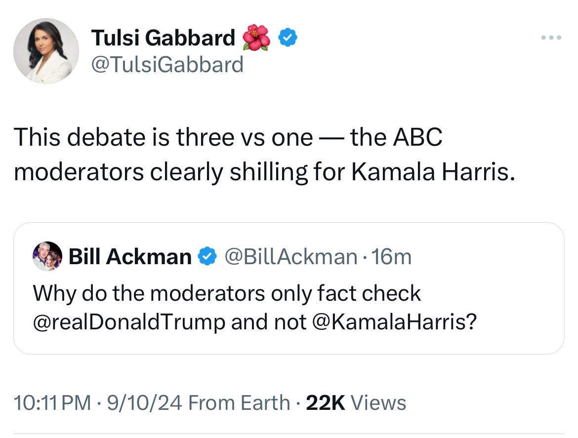 Tulsi - MODERATORS clearly SHILLING for Harris Posted By: jensingr In Response To: BREAKING: Trump tells Harris “I’m talking now.” (jensingr)