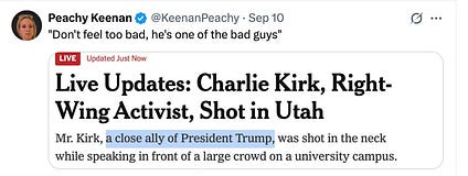 And then, Wednesday, a marksman as yet unidentified murdered Charlie Kirk, 31-year-old rising conservative media star, whose main activity was traveling to college campuses to discuss and debate the great public issues of our time with students. Charlie Kirk was an exemplary young man, on a mission to rescue our country from bad ideas and help young adults beset by the depraved Jacobin faculty discern the difference between good ideas and bad ideas. He’d barely got going in life. I won’t belabor the encomiums to Charlie’s excellence that you can read elsewhere all over the web. He was the real deal, a man in full. The Left has its martyr, the degenerate George Floyd, and now the right has its martyr, the righteous Charlie Kirk. Choose your hero.