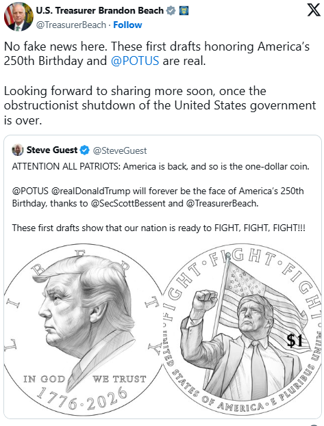 Quickly following President Trump deleting his Medbed revelation post, this report concludes, leftists slammed as fake the news that a $1 silver coin was being made to celebrate President Trump on the 250th Anniversary of America next year—but these leftist recoiled in horror after United States Treasurer Brandon Beach announced yesterday: “No fake news here...These first drafts honoring America’s 250th Birthday and President Donald Trump are real...Looking forward to sharing more soon, once the obstructionist shutdown of the United States government is over ”.