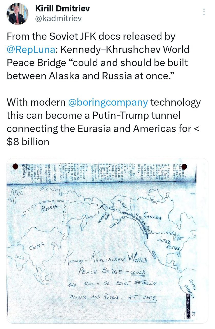 For example, Russian sovereign wealth fund head Kirill Dmitriev is proposing a tunnel linking Russia with Alaska: Imagine connecting the US and Russia, the Americas and the Afro-Eurasia with the Putin-Trump Tunnel – a 70-mile link symbolizing unity. Traditional costs are $65B+, but @boringcompany ‘s tech could reduce it to <$8B. Let’s build a future together! “Isn’t it better to link Africa–Eurasia with the Americas, Russia, and the US via an Alaska–Russia tunnel than to increase the risks of WW3?” Dmitrie continued.
