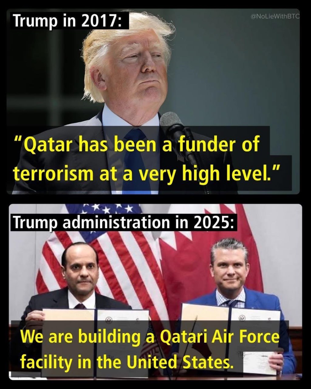 Also, in 2017, Trump called out Qatar as a terrorist financier. Now the “Trump” administration wants to build a Qatari military base in the US (presumably to target American patriots).