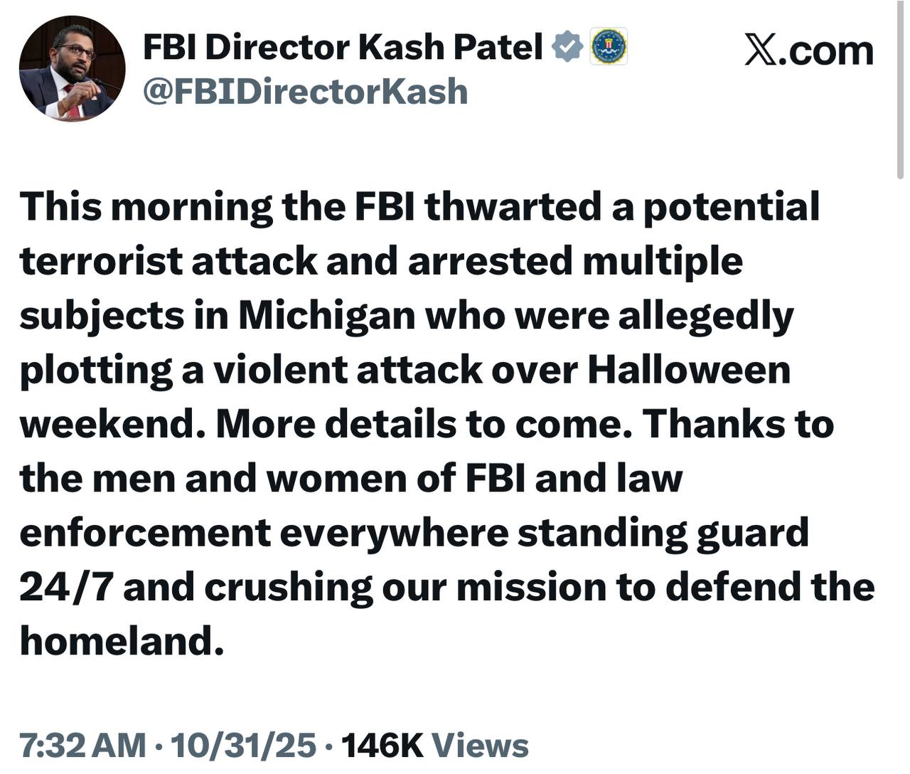 FBI DIR KASH PATEL: FBI has thwarted potential TERRORIST ATTACK in MICHIGAN!!! Posted By: jensingr