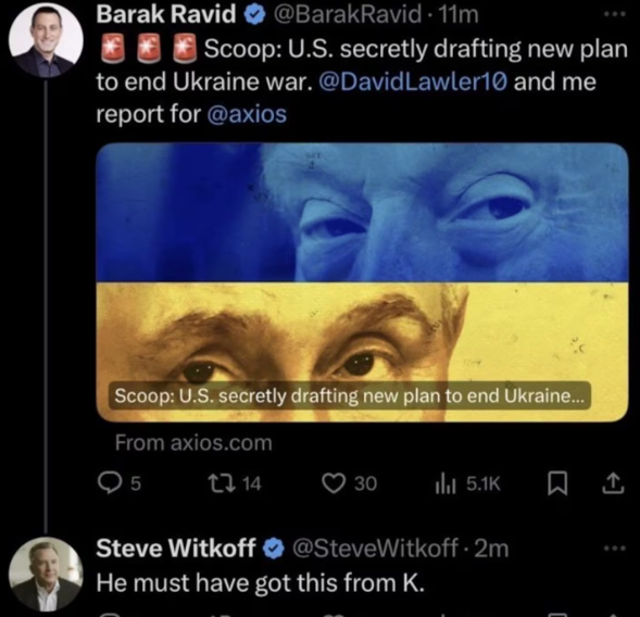 Next up in the American failed war game is President Donald Trump, about whom Axios reporter Barak Ravid posted this week: “Scoop: U.S. secretly drafting new plan to end Ukraine war”—President Trump’s special envoy Steve Witcoff, who is negotiating with Russia, mistakenly posted the public reply about the Axios scoop: “He must have got this from K”—and the mistaken identifying of “K” as the leaker to Axios by Witcoff was quickly followed by the news: “President Donald Trump’s special envoy for Ukraine, Keith Kellogg, is planning to step down in January”.