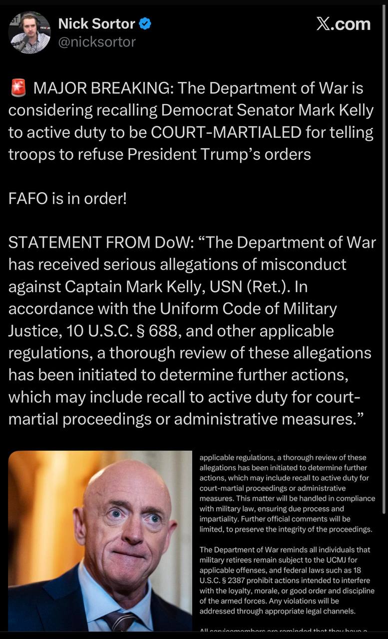 MAJOR BREAKING!! Mark Kelly may be RECALLED to ACTIVE DUTY for COURT- MARSHALL Posted By: jensingr