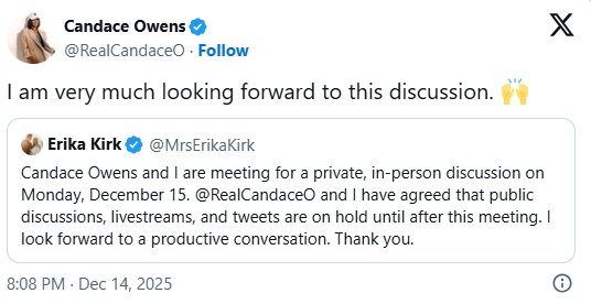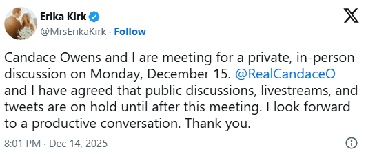 With the house of lies constructed her around crumbling, this report concludes, last evening Erika Kirk posted the announcement: “Candace Owens and I are meeting for a private, in-person discussion on Monday, December 15. @RealCandaceO and I have agreed that public discussions, livestreams, and tweets are on hold until after this meeting…I look forward to a productive converstation…Thank you”—and in response to Erika Kirk fleeing to her for protection, Candace Owens replied: “I am very much looking forward to this discussion”.