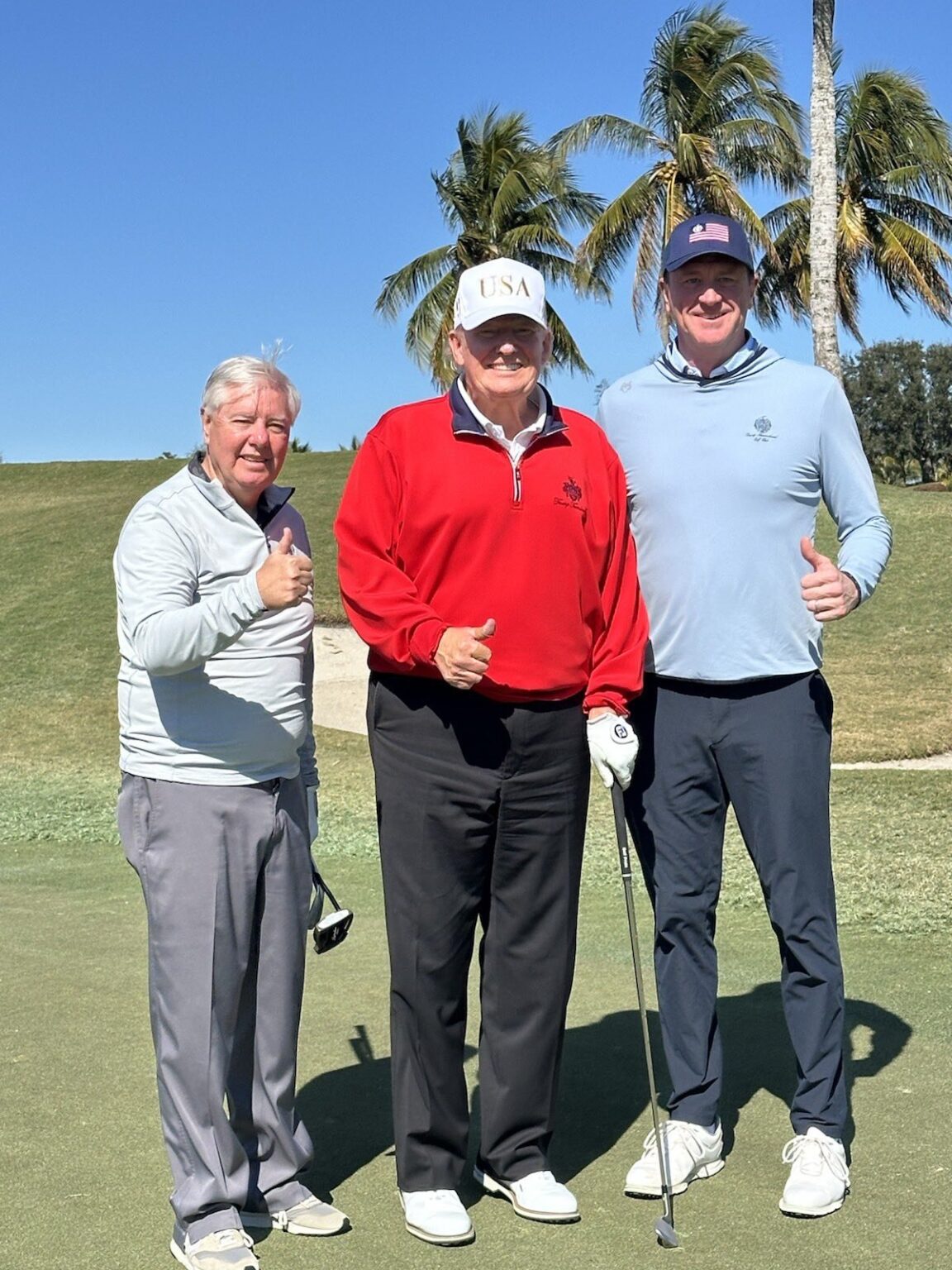 Now look at this picture of a fake “Donald Trump” who is supposed to be 6’3” (190cm) golfing with Lindsey Graham, height 5’7” (170cm), who wants U.S. soldiers to be prepared to die for Israel in a war with Iran. Republican Senator Eric Schmitt is next to Trump, and news articles say he is 6’ 1” (185cm) tall. What is true?