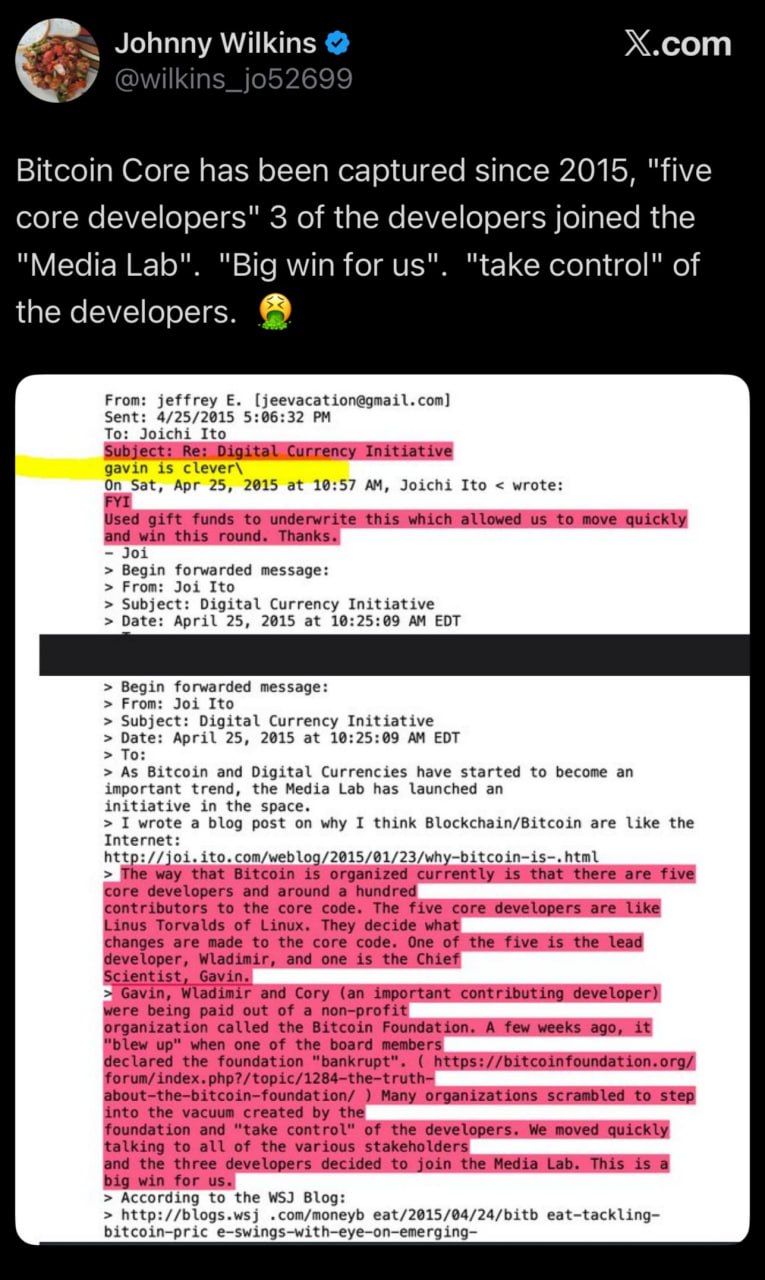 Bitcoin Core has been captured since 2015, “five core developers” 3 of the developers joined the “Media Lab”. “Big win for us”