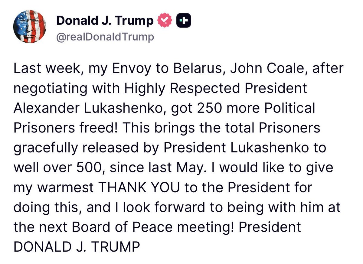 PRES. TRUMP got 250 MORE Political Prisoners FREED from BELARUS Posted By: jensingr