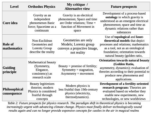 This has the philosophical consequence that Beauty as a criterion for research is problematic if it is not linked to Fertility. Alfred Nobel established his Prize for the person who has brought the greatest benefit to society in the preceding year. If the awarding of prizes in Theoretical Physics were judged according to the original criterion, a number of previous Laureates from recent decades would have to return their Prizes. Any critique should also include a future perspective. Table 2 outlines the path to a Paradigm Shift towards a process-oriented, primordial physics. This would shift research from an aesthetic standard (“beautiful”) to a productive standard (“fruitful”). In the long term, this could lead to a new synthesis of theory and experiment—similar to the theory of electricity in the 19th century, but with a deeper ontological foundation.