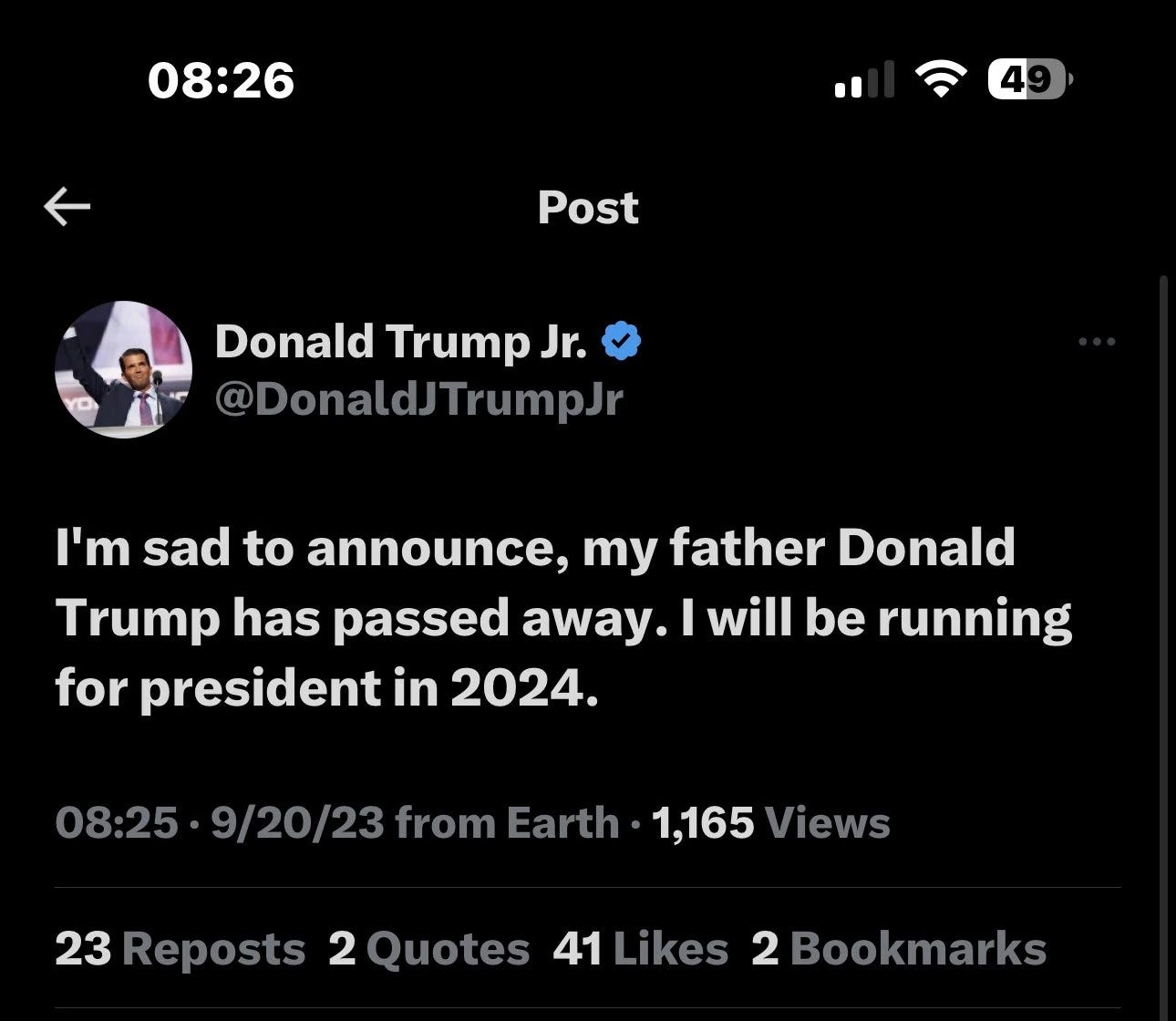 Post from Donald Trump, Jr on 9/20/23. Was this an admission of Truth ? Or some type of hack ?